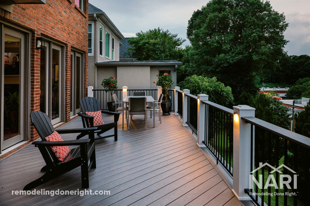 The clients wanted low maintenance products, a clear view of the pool and green solutions for the porch, deck and patio areas of their home. Green Solutions include LED lighting, PVC trim, composite decking with hidden fasteners, reuse of the old framework for Y-bracing on the porch, and glass railings. Overcome obstacles include reusing the porch framework and hiding electrical wiring. Now, new glass panels provide a clear view to the pool from the lower level patio. The new porch interior includes a beadboard ceiling and tile floor; and the deck features aluminum railings with PVC columns and composite decking installed on the diagonal.