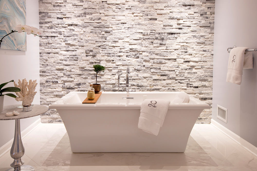 As the last of a three-stage renovation process, this master bedroom was transformed into a master suite with the addition of a new master bath and repurposing space for new his-and-hers custom closets. The master bath was designed in a U-shape with a center tub room flanked by two identical baths. The client wanted to replicate a luxury hotel bathroom, which was designed with two private yet generous individual spaces within one bathroom. The addition, skylights, ledge stone accent walls and a large chandelier are just a few details that gave the client what they desired: luxury and space.