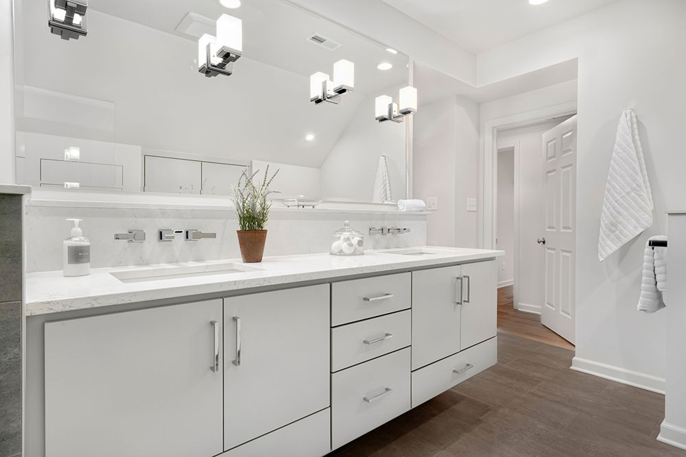 This bathroom addition re-purposed 110 square feet of unused attic space into a beautiful functional space. The family of six-four of them teenagers-needed an additional hall bathroom on their second floor. The contemporary space was driven by the design and style of the three daughters who decided early on the new bathroom was going to be for them. A hidden door in the new bathroom provides access to the rest of the attic space. The new bathroom was finished in a gray and white color palette and includes a walk-in shower, double vanity, make-up table, and recessed linen cabinet.
