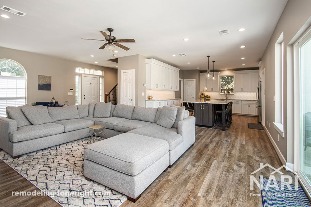 This project began because of a broken water line flooding the downstairs. The homeowners hated the layout downstairs, so the water damage became an opportunity to change the layout and transform the space into a area they love to use. Every room downstairs was too small and cut off, the space lacked storage, the laundry area was in the kitchen and, awkwardly, so was the powder bathroom. The new addition included space for a large laundry with storage, bathroom, downstairs bedroom with adjoining bath, and a fireplace. It also opened up the original downstairs floor plan to enlarge the kitchen.