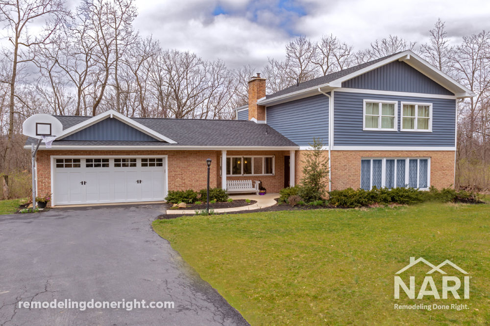 After owning several houses in developments, the owners were interested in a house with more land and no immediate neighbors. They found a house, but it needed an exterior update. This included an addition on the rear to enlarge the dining room as well as provide a covered patio area. Additionally, the entire exterior of the house was given a facelift by removing the second-floor low-pitched roof and installing a new trussed roof. The exterior was finished with beautiful blue siding and white trim boards. The result is a home that barely resembles the original.