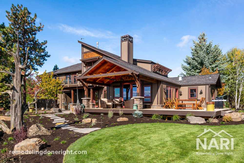 The beauty of the natural world provides great design inspiration. This nature-loving family wanted to create an outdoor space to better enjoy their spectacular river view. Also on their design wish list: more bedroom and office space, as well as gear storage. The addition extended the garage with a third bay and provided space for a new bedroom above the garage, while the new covered deck was extended off the living room. The design dramatically expands the living space with both interior and exterior square footage and extra storage.