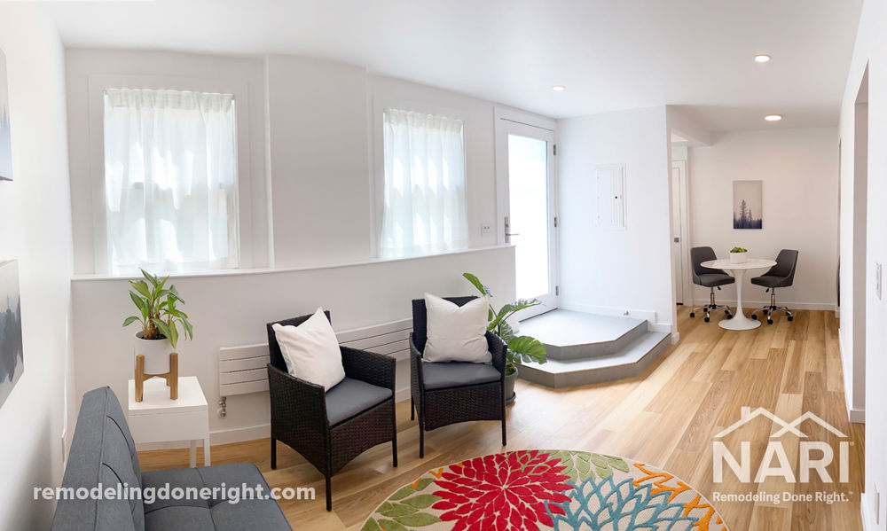 These Gen-X homeowners purchased their first home not realizing how much it would become like the 1986 film, The Money Pit. They discovered the duplex listing was incorrect as far as the building department was concerned. Although this first floor apartment dwelling had been built below the main dwelling unit during the 1930s Great Depression, its illegal habitation had been noted in cease-and-desist citations ignored by the previous owners since the 1960s. This illegal rental unit became the critical driver towards remodeling. The result provides consistent income to contribute towards affordable home ownership and rentability at the highest market value.