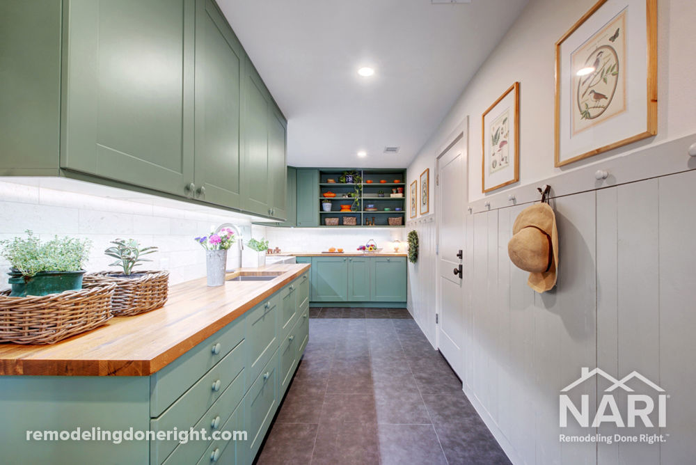 You'd never believe this elegant space is so hardworking! Looking for organization, these homeowners converted a portion of their garage and a closet into an all-purpose room. But it's what you don't see that makes this addition such a game changer. The drop zone has hidden lockers; the washer/dryer wall is double thickness to block noise; and cabinets hide laundry, a home office, and even a garden center. Whether this room is being used as a drop zone, mudroom, laundry room, home office, pantry, second kitchen, or urban garden, it does it while bringing organization and class to the chaos.