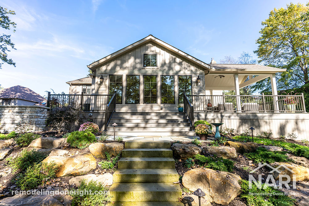 Wanting to replace their dated sun porch with a great room, these homeowners created a new addition that was both spacious and cozy. With beautiful architectural features ranging from transom windows to wood beams, to vaulted shiplap ceilings, this space brings the outdoors in. The attached covered porch area and concrete patio keep the backyard easily accessible, making it the perfect place to relax and entertain.