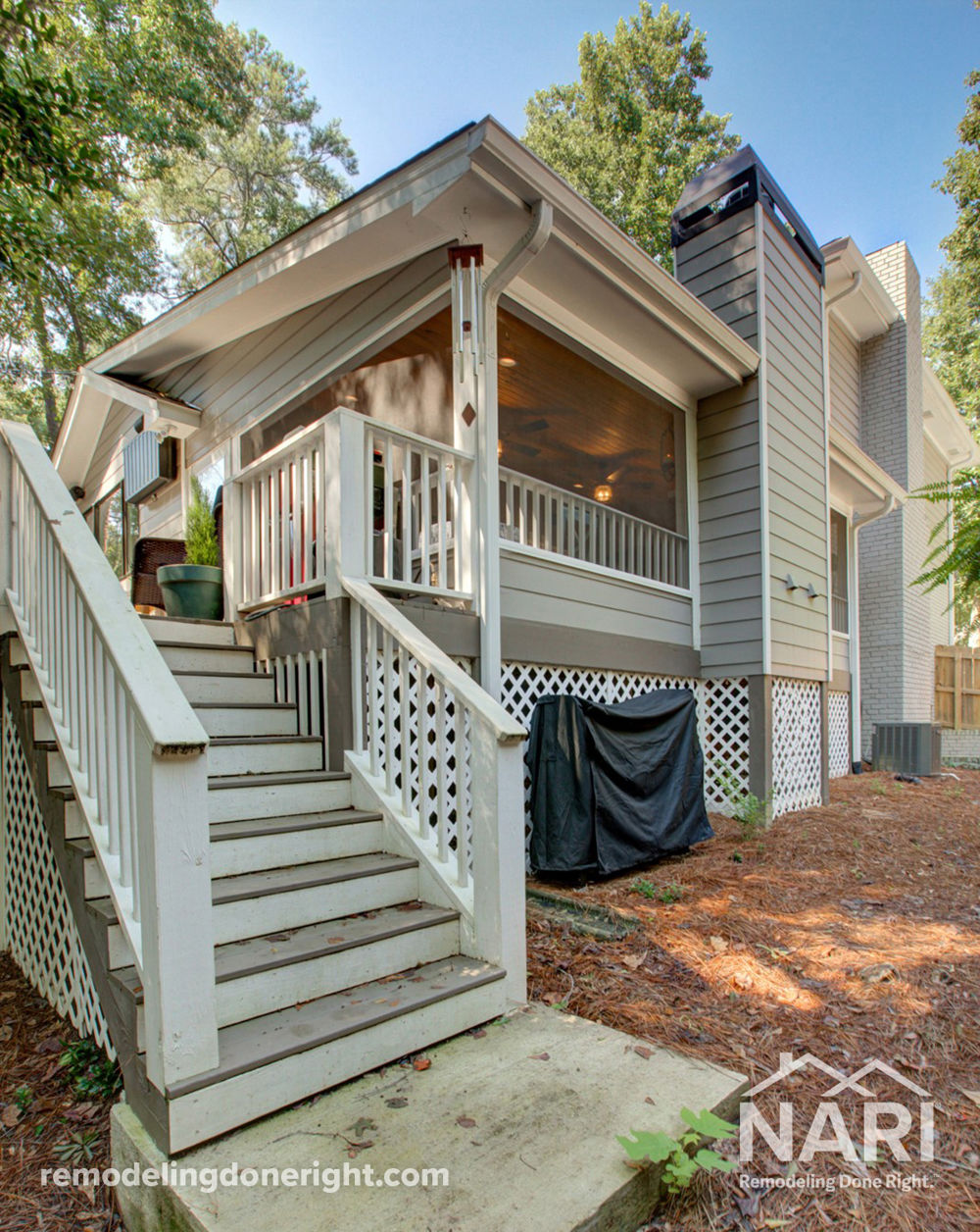 Wanting to utilize their deck more, this family needed to adjust the design. To begin, the stairs were relocated to improve floor traffic, and a knee-wall-and-railing hybrid provided an extended view of the yard while protecting the family's furry friends. With plenty of sitting areas, a wood burning fireplace, and oversized screen windows, this new space is designed for gathering and relaxing.