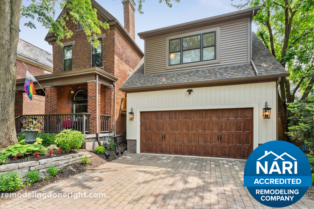 These lucky homeowners had a double lot in a historic neighborhood. Just enough space made way for a new two-story addition with a two-car garage below and a primary bedroom suite above. Existing side windows and door openings were expanded for access to the house on the main floor and in the basement. The garage offers access to the backyard, and the stairwell boasts a Juliet balcony to enjoy the flower beds below.