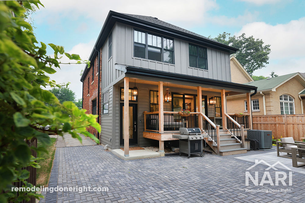 This home was filled with multi-purpose spaces that were not cohesive or functional for this young family. It became clear they needed more space and rooms with designated functions. A two-story addition created a new primary suite and back porch, plus opportunities to better define the existing spaces. The mudroom moved out of their dining room, allowing for a swanky home bar. The first floor's full bathroom was downsized to a powder room, providing space for a walk-in pantry. Upstairs, a relocated laundry room, reimagined kids' bathroom, and gorgeous primary suite made the entire home finally feel right-sized for them.