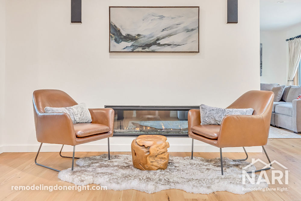 The goal for this addition was to add a spacious and bright kitchen with roomy seating island and ample work centers. To create volume, the ceilings would be vaulted with skylights. The cabinets were outfitted with storage access solutions and large drawers, an induction cooktop with a hood, and wall ovens. The views shifted to the private backyard and hill views by relocating the access point from a widened and modernized entry foyer. The wood-burning living room fireplace was replaced with a double-sided linear gas unit. Existing hardwood floor were extend throughout the addition.