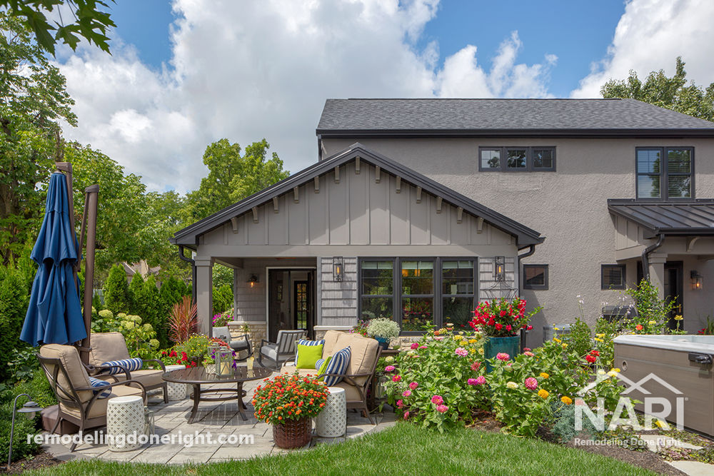 These homeowners desired an expanded family's dining room with a linear gas fireplace with stacked stone surround, built-in window seats with storage, and more windows to take in the gorgeous views of the front and backyard landscaping. Two porch additions (front and rear entries) were also part of this project, along with other front exterior upgrades to enhance the home's curb appeal and tie in the new family room addition to the rest of the front exterior of the home.