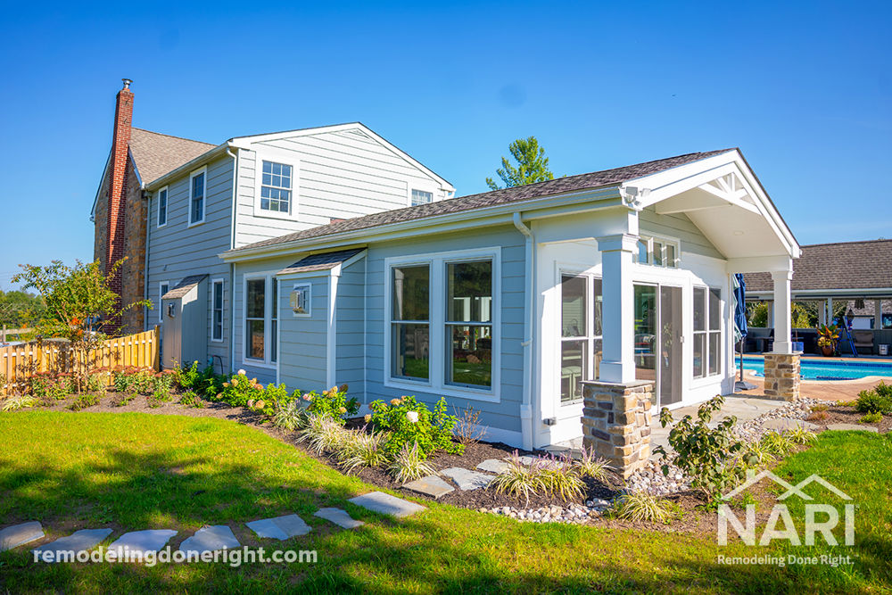 This project entails a 600 sq. ft. great room addition to a historic 1790s farmhouse. The interior boasts radiant floor heating, a gas fireplace with a stacked stone surround and blue stone hearth, custom-built bookcases, and decorative box beams. Externally, James Hardie siding, Azek trim, and stacked stone columns anchor the structure, seamlessly blending modern comforts with the timeless farmhouse charm. This harmonious integration of new and old promises a cozy and inviting living space while preserving the heritage of the original home.