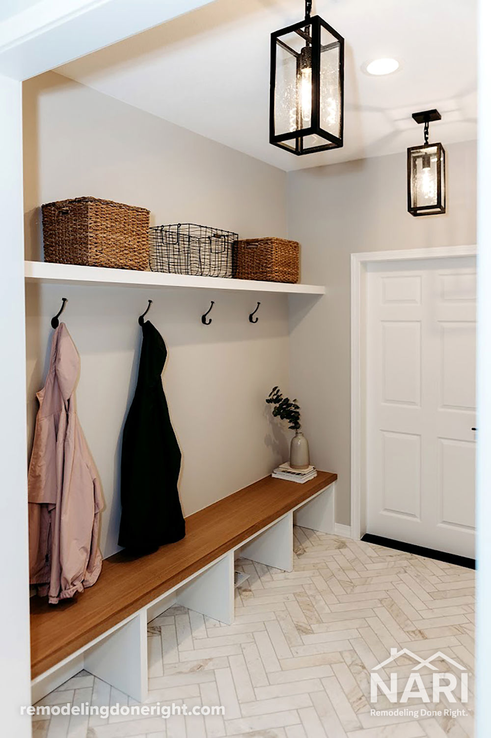 The homeowners wanted to add a mudroom to a space initially occupied by an underused staircase, laundry room, hallway, and powder bath. Achieving this transformation necessitated removing the staircase, deconstructing the entire space, relocating the powder bath, garage entry door, and reconfiguring the laundry layout.