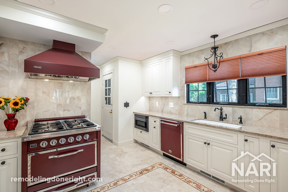 Inspired by European designs, these homeowners wanted to update their kitchen, powder room, and breakfast area while keeping the original footprint intact of this 100-year-old Tudor Revival home. The updated spaces balance modernism and whimsy, with bright floral designs and marble adorning every room. Red accents weaved throughout the home, along with stunning finishes, showcase the craftsmanship and artwork of this project.