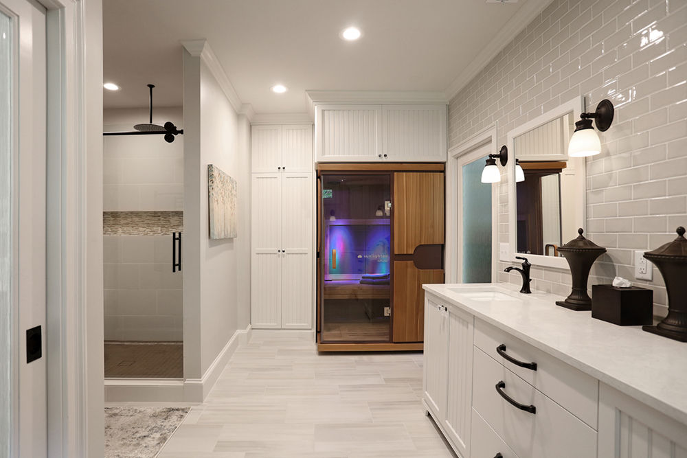 This 1990s home had a dated bathroom with an awkward layout. Accessing the bathroom required walking down a narrow hallway, past separate walk-in closets. The new design flipped the closet spaces and the bathroom to create a direct entrance to their new spa-like retreat. The bathroom boasts an infrared sauna for two, a roomy linen closet, a dressing area with make-up vanity and a private water closet. It also has heated tile floors, a heated towel rack, plus a heated walk-in shower. Gleaming pearl subway tiles create a lovely backdrop behind the white custom cabinetry topped with quartz, which provides storage galore.