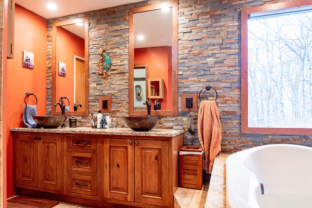 The existing master bathroom had out-of-date finishes that did not complement this contemporary style home. Worse yet, they did not fit the desired rustic aesthetic the homeowners wanted. With space at a premium, it was important to efficiently redesign the room to increase functionality. Features include a double-vessel vanity with his and hers mirrors and custom cherry cabinetry, stone-stacked slate walls, and rustic travertine on the floor and in the enlarged shower area. Pebbled flooring was added to the shower and designed into the main bath floor area as well. The reconfigured master bath is now more private, more inviting, and more usable.