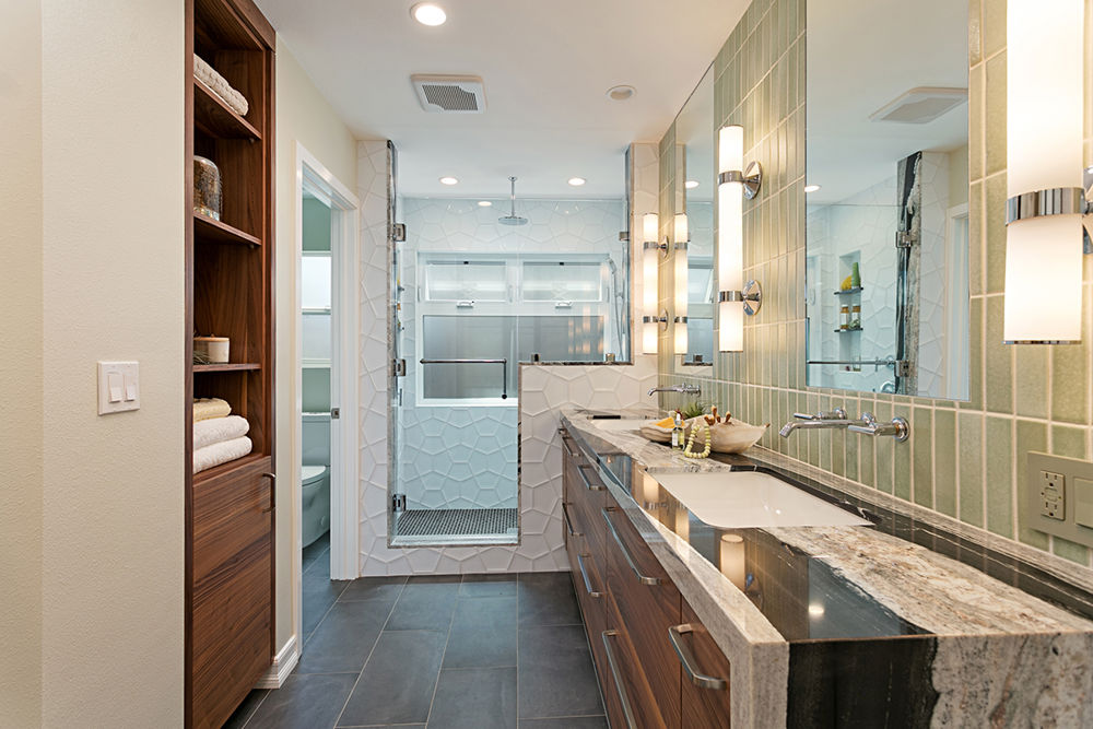 These empty nesters wanted their master bathroom to be a luxurious retreat with a wow factor. Their existing bathroom had limited storage and an awkward layout overwhelmed by a cat patio. The new design balances complex textures and a subtle color palette with a masterful mix of materials. A sumptuous shower with three types of tile replaced the tub. Abundant natural light reflects on a backsplash of aloe green handmade tile. A striking waterfall quartzite countertop distinguished by bold stripes of ebony against natural gray and brown tones is a focal point in this rejuvenating haven.