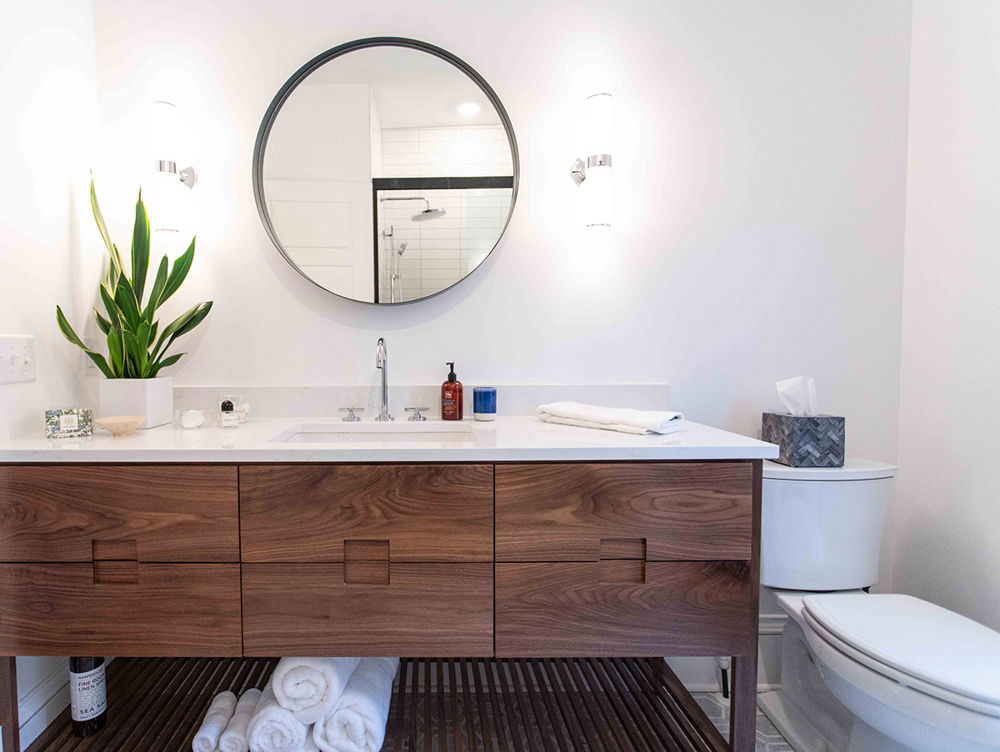 The clients wanted to update their main bath with modern updated finishes while honoring their 80-year-old home. They desired storage, a large shower, clean finishes, working surfaces and a roomy feel that did not disturb the outer roofline of the home. The clear glass shower doors and freestanding walnut vanity with slatted open bottom makes the space feel bright and open. A quartz top, undermount bowl, round mirror, wall sconces, tiled floors and large matching millwork give this space an updated, sleek and highly functioning space for the owners.