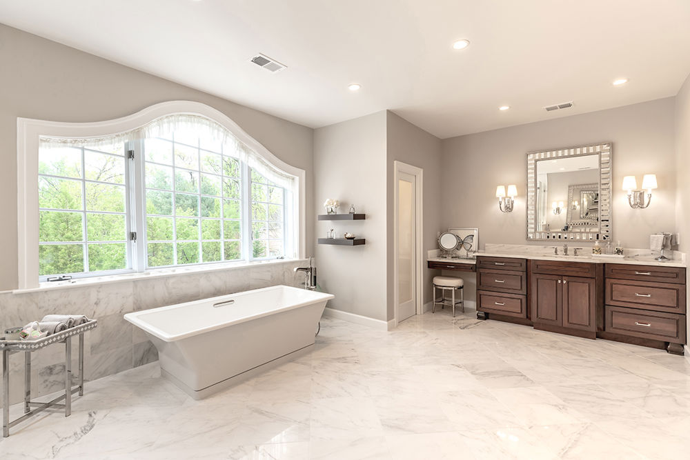 This couple wanted a master suite with a high-end spa look, marble floors and walls, a large shower, open space, a private commode area, his and hers vanities, and lots of upscale amenities. The old bathroom was totally gutted; the closed shower area opened to make room for a large walk-in shower with a built-in bench, frameless glass door, and state-of-art shower system. The free-standing tub is surrounded by marble on the floor and the walls and rests under a new eyebrow picture window. Two vanities with built-ins, framed mirrors and marble counter tops, and a private commode with a frosted pocket door complete the space.