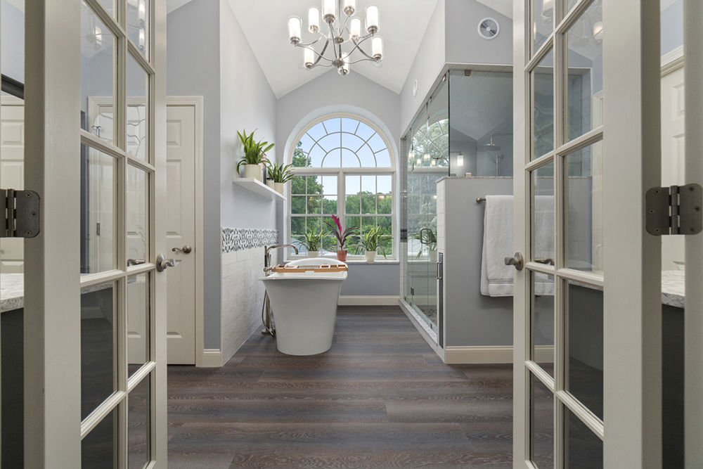 The homeowners wanted a master bathroom oasis that mimicked the details and finishes in the rest of their home. To achieve this, every inch of the space was utilized. The layout stayed relatively similar by only tweaking a few angles and entry points. The built-in tub was removed and replaced with a 72-inch freestanding soaking tub and serves as an art piece in itself. The steam unit and custom glass and tile provide a luxurious feel to their large walk-in shower. Removing and utilizing soffits enhanced their vaulted ceiling to make a huge impact vertically.