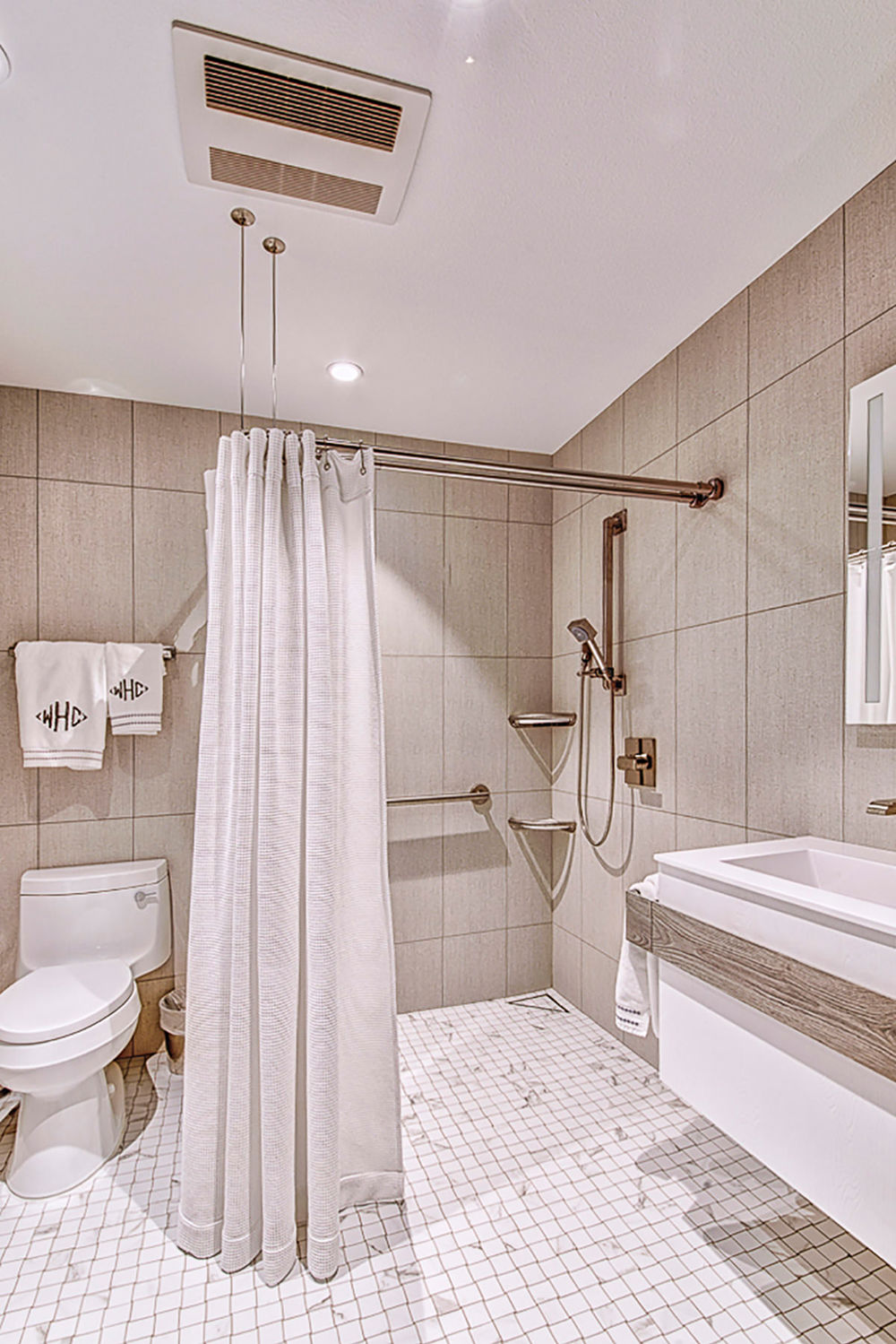 The homeowners wanted to renovate this bathroom to accommodate a variety of guests. They desired a space aesthetically equivalent to the luxury hotels they like to stay in but, at the same time, function well for any guest no matter their age, height, body type, physical stature, or motor ability. They wanted their guests to have a spa-style bathroom that incorporated universal design principles and would accommodate more than one person at a time. The new bathroom has an open floor plan, a neutral color palette and is outfitted with porcelain tiles, quartz counters, high-pressure laminate floating cabinets and grab bars throughout.