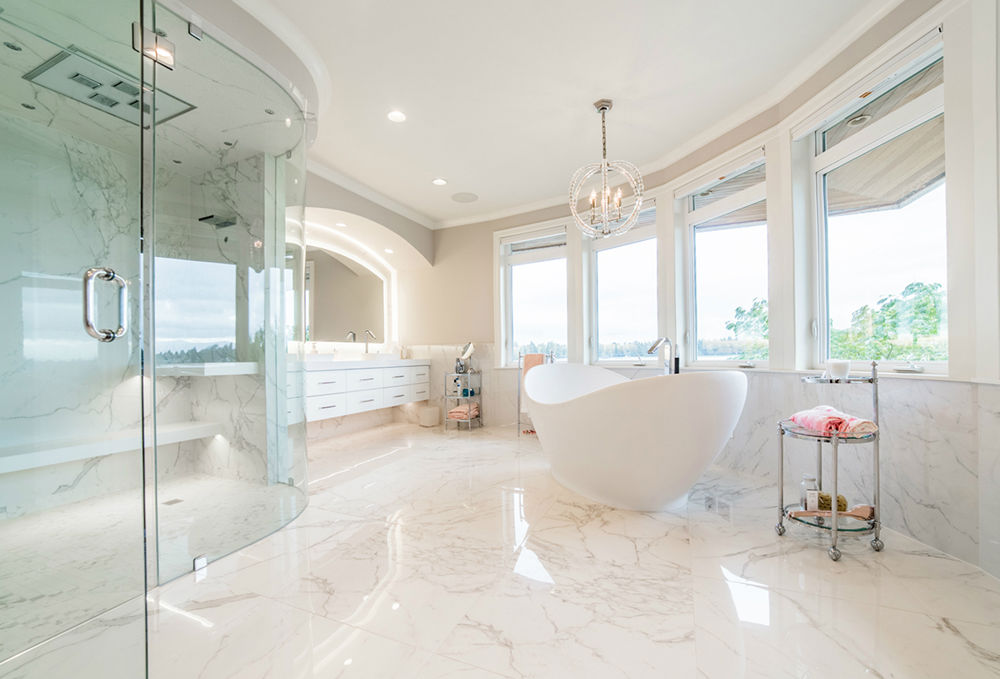 The clients had recently purchased their home with stunning lake views. Unfortunately, the master bath did not take advantage of the view, was dark and felt out of place. To take full advantage of the amazing view, brighten up the space and give it a spa-like feel, large windows were added. A decorative chandelier above the large freestanding tub now rests under the windows. A custom Kohler steam shower with frameless glass enclosure features LED lighting and quartz benches. A custom mirror with a TV and LED lights is positioned above the floating vanity with quartz countertop. Polished porcelain tile with a marble look installed throughout completes the look.