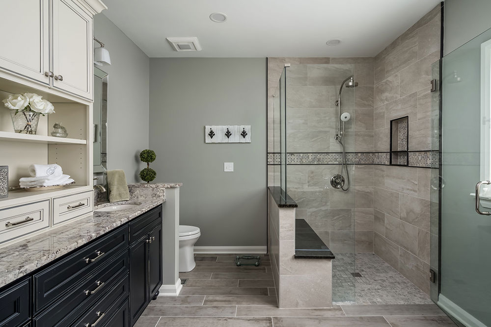 The floorplan of this spacious master bathroom did not function well for the clients. Builder grade fixtures and finishes were starting to show wear and tear. The tiny stall shower was cramped into a water closet and a huge soaking tub was cumbersome to use and clean. These aging empty nesters desired low maintenance materials, traditional style and a spacious zero threshold shower with a bench and multiple shower heads. The space was outfitted with nickel hardware, 12-inch by 24-inch wall tile with a marble mosaic tile accent in the shower niche and border, gray floor tile, a dark granite shower bench and white granite counter tops.