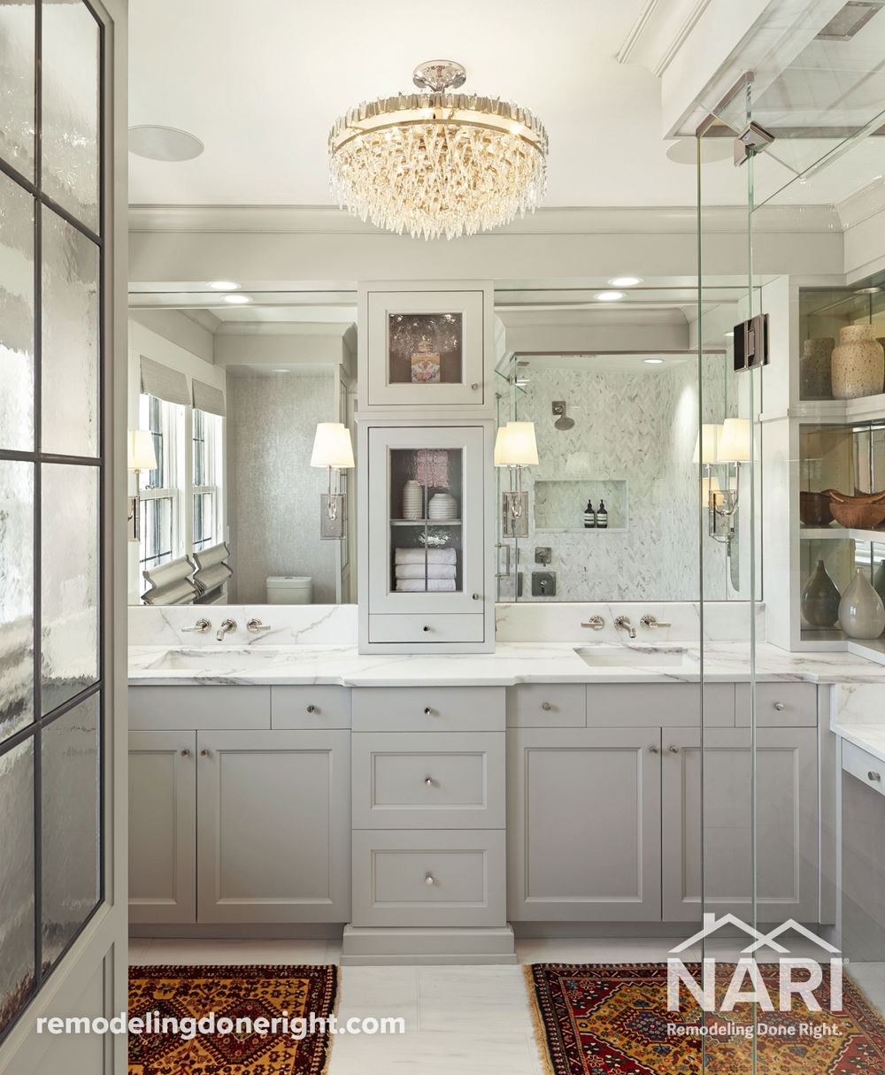 This master bath remodel did not modify the room area, but the existing bathroom was completely gutted and transformed into a space that better harmonizes with the existing classic home. The room now features double vanities, a separate makeup vanity, in-floor heating and elegant white marble throughout. A curb-less steam shower includes a bench, dual shower controls, speakers and rain water tiles overhead. A custom partition was added alongside the toilet to provide privacy, while still maintaining an openness in the small room. The result provides a serene escape from the crazy world in which we live.