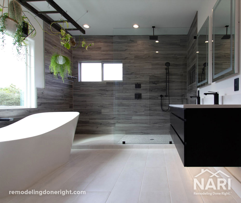 This spa-like modern bathroom required relocating an interior wall to create more space, and moving all of the plumbing, drain lines, and electrical. In addition, a large window was added to frame a new free-standing bathtub. The new floating vanity is accented with large LED mirrors and includes additional LEDs below the cabinet. The clients are delighted with their modern bathroom, which has a custom plant hanger over the tub that will flourish with the new window's added light. The new space is a place where they can retreat and relax.