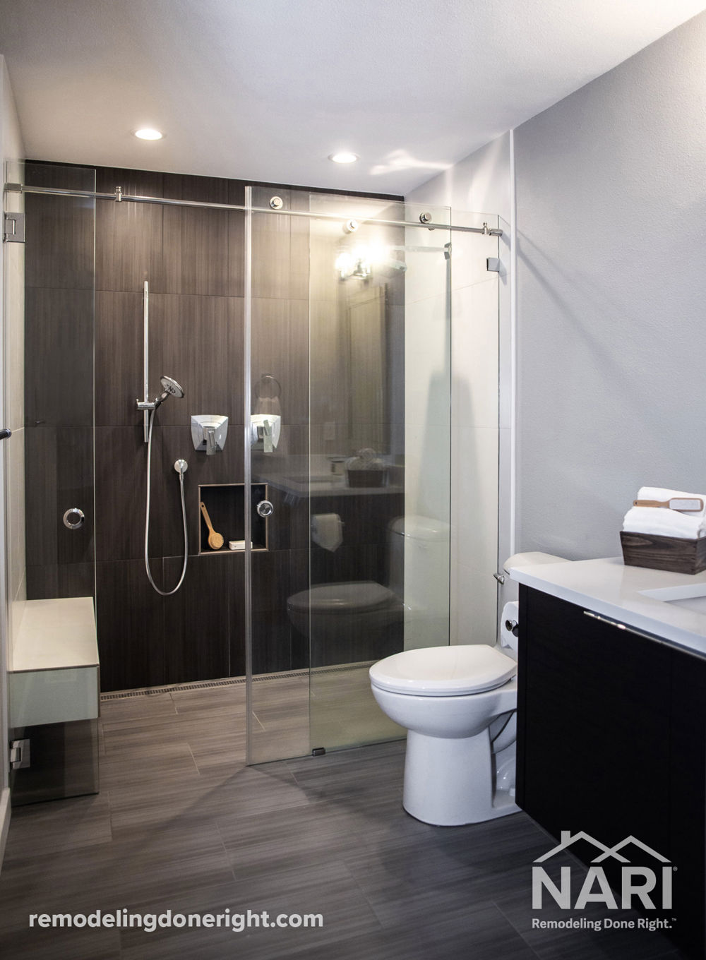 This homeowner required barrier-free features, so a bathroom was designed with accessibility and modern styling. Innovative techniques used helped overcome small space limitations. Now this masculine-influenced bathroom values both function and form, with a design that maximizes the use of a small space while being tailored to meet the client's specific needs. A barrier-free entry and unique custom shower door design also provide full wheelchair-accessibility in a tight area. The shower area includes a bench that is 18-inches above the shower floor, fixed and detachable showerheads, a slide bar and shelf. The look is highlighted with a dark brown tile accent wall.