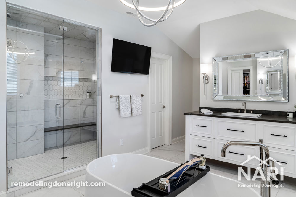 These repeat clients were looking for a change in their dated and dark master bathroom. As busy doctors, they were often up and out of the house before the rest of their family or arriving home well past bedtime. They wanted a sanctuary to begin and end their day. The space features a walk-in shower, free-standing tub in the center of the room, new vanities on opposing walls, and a make-up station with additional storage below the windows. The same tile was used throughout but cut into different shapes. They are thrilled with their new spa-like bathroom sanctuary and are excited to enjoy its tranquility for years to come.