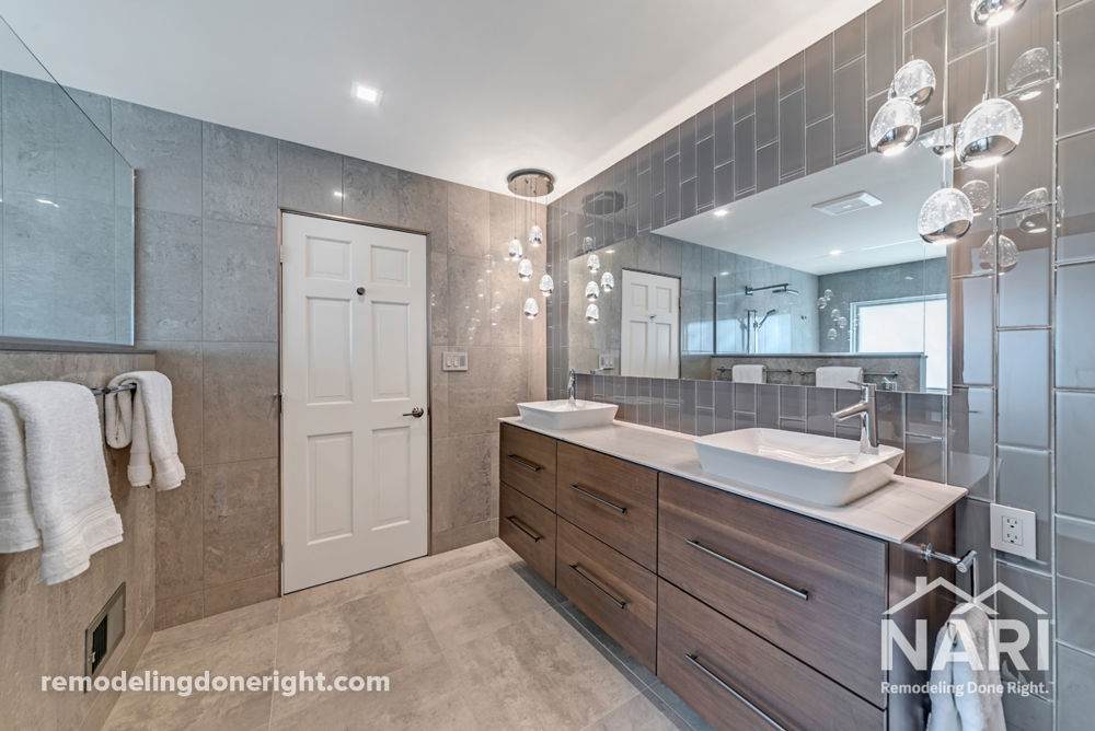 These long-time clients were finally ready to invest in an oasis that was all their own. They desired a contempary design with a spa-like atmosphere, a large shower and tub, and maximized storage. This sleek, modern master bathroom packs all of their wish list items into one cohesive retreat. This new aesthetic was achieved through chrome fixtures, a smoky taupe color palette and creative lighting. There is virtually no wood in this contemporary master bathroom-even the doors are framed in metal. This lack of earthiness increases the impact of the sleek, walnut double vanity.