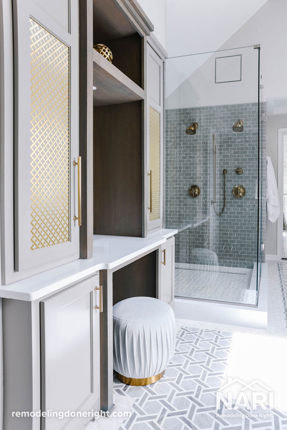 The clients wanted to transform their master bathroom into a luxury space that connected with the rest of their home. From dated to designer, this master bath underwent quite the transformation. A massive corner tub was traded for a sleek floating version, and the cramped fiberglass shower was gutted to make way for a much larger custom shower with six different tiles. Awkward angles from the old space were eliminated. A cathedral vault replaced the 1970s slanted ceiling, and a new custom makeup vanity fills the space where an angled wall used to live. Custom woodwork touches warm the space, while a heated floor warms your feet.