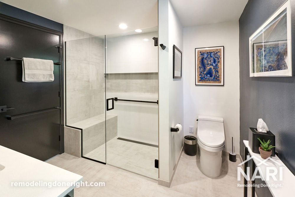 This master bathroom remodel project solved two problems in the client's home. It added an entry into the master bath from the master bedroom, and it fixed the inability to maneuver the space efficiently with existing clearances. By manipulating the existing layout, a more functional space was created with adequate clearances beyond the designated stations of the shower, vanity and toilet. The new layout ensures ease of use for each station as the client ages in place through her remaining years in her home. The result is a contemporary master bath transformation.