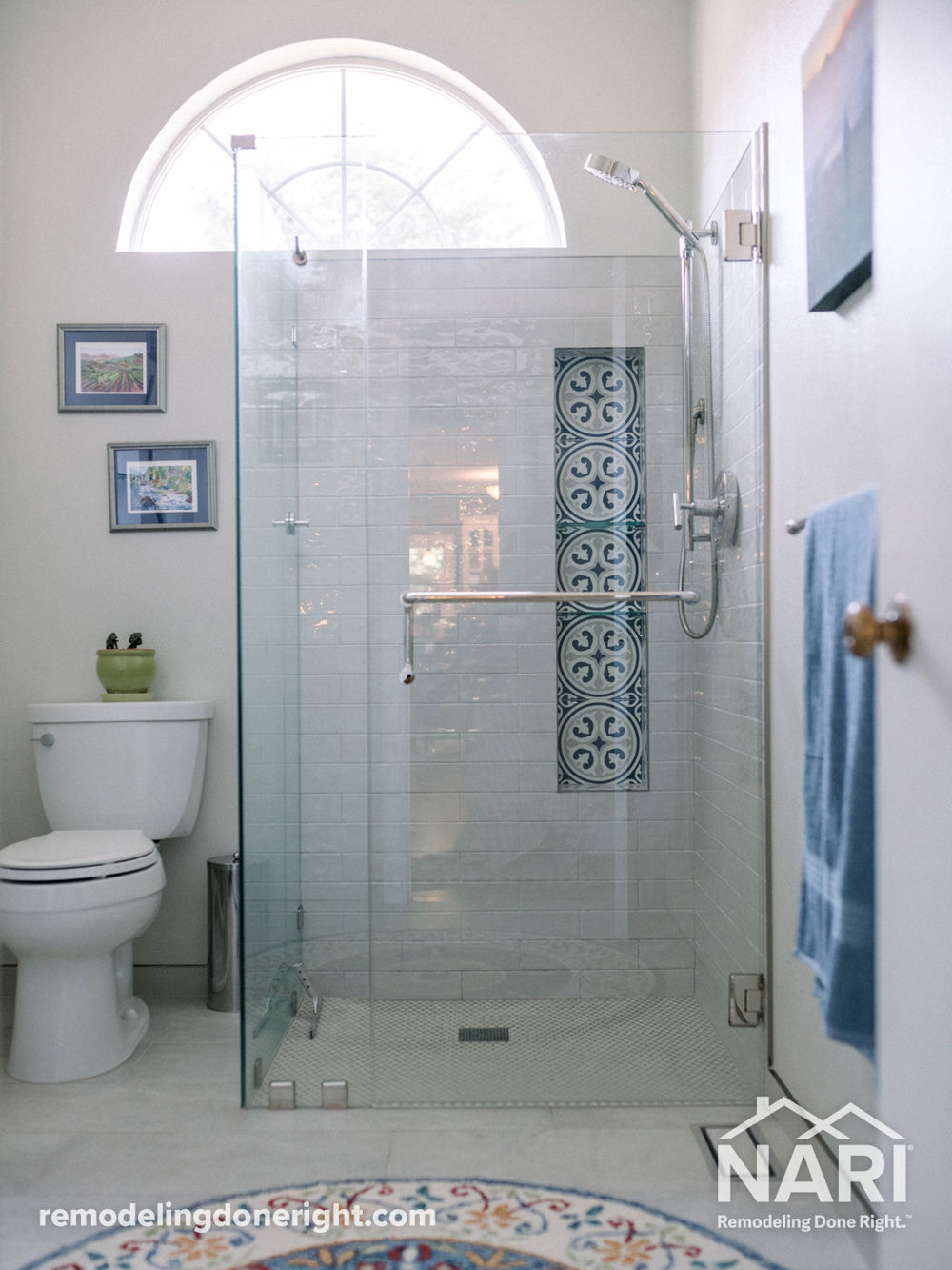 Several factors went into designing and remodeling this guest bath. The clients needed the bathroom to be safe and accessible for aging parents when visiting while looking beautiful and matching the style of their home. Relocating the shower, sink and toilet added additional space. The design began with the shower niche tile and evolved from there with the complementing subway tile and the walnut vanity with integrated sink. The new space matches the aesthetic of their home seamlessly and captures the style of the homeowners.