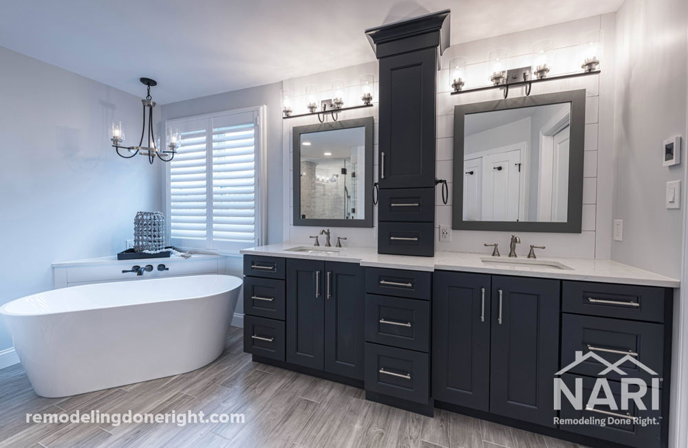 This project has a very fun and unique design and layout. The client wanted to update and change the look of their outdated bathroom, solve lighting and storage issues, and add unique design elements to the space. Modifying the existing layout increased the size of the shower by moving the toilet forward and into a separate water closet. A beautiful freestanding tub with angled wall for the tub spout was included as well. The cabinetry features a tower in the center of the vanity for extra storage. Shiplap accents behind the vanity and on the water closet wall bring a fun visual to the space, while the navy cabinetry accents the flooring.