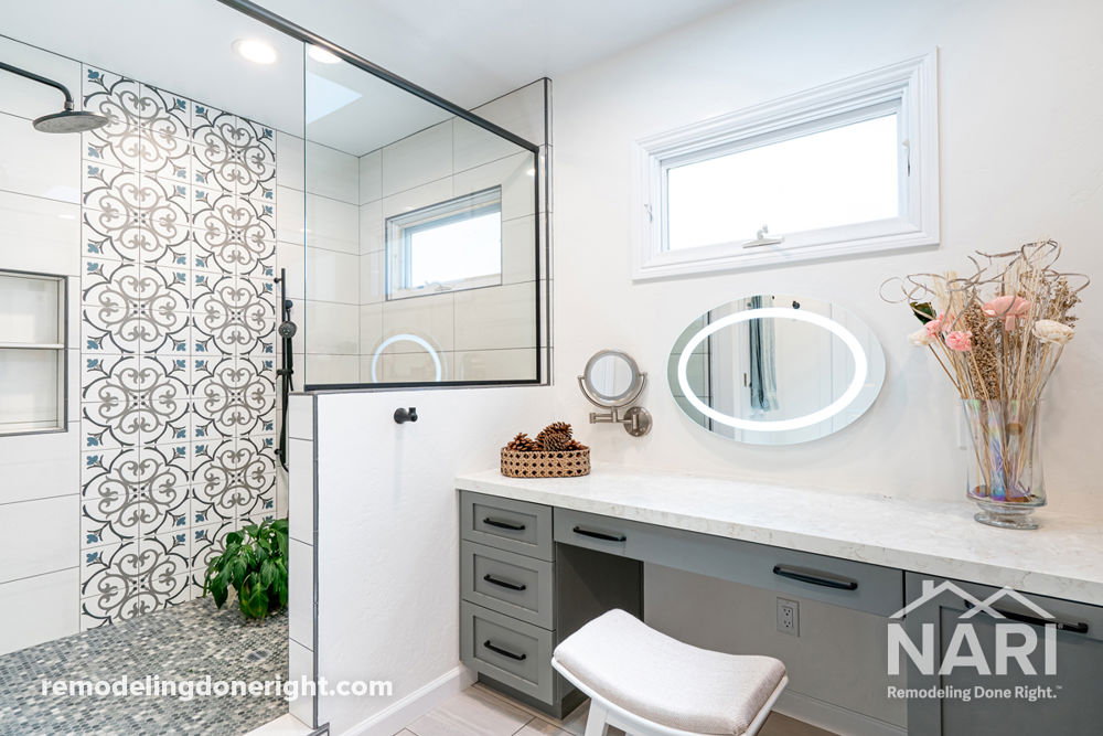This dated master bathroom was falling apart. The general layout was actually quite functional, so fixtures were removed and replaced rather than relocated. The shower was upgraded with a pony wall to provide a bit more privacy as well as a custom shampoo niche for a cleaner look. The vanity was completely removed and replaced with more functional cabinets along with custom storage such as the custom pull out at the vanity area. Clean lines and a serene color scheme ensure the space eases one's mind upon entering.