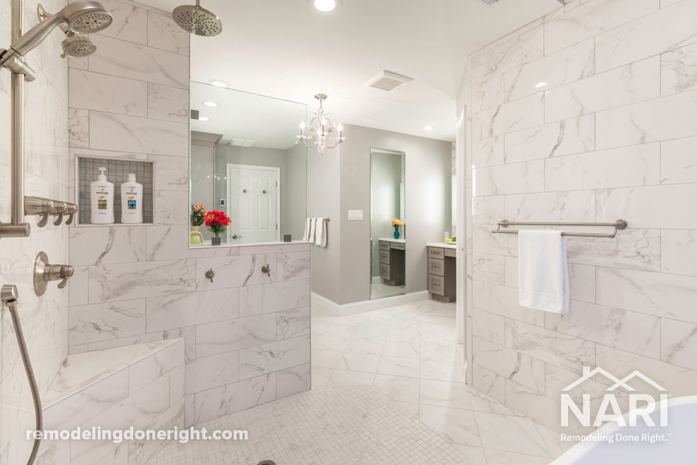 The owners dreamt of an open concept master bathroom suite with a roman style open shower and wet area, soft color tones and an airy feel. Dead space in the adjacent attic provided additional space for the bathroom. The tub was relocated and an open wet shower area was added next to it. Floor-to-ceiling large-scale marble looking tiles, complemented with mosaic were used for the shower area, linen cabinet, long vanities and counter space. The toilet now rests behind the door where the original shower stood. Soft taupe cabinetry with white marble counter tops complete this gorgeous master suite.