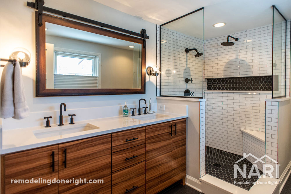 When purchasing this home, these homeowners intended to add a master bathroom within the existing footprint. To their dismay, several contractors told them it would be impossible to run the plumbing. By utilizing a small amount of space in a first-floor closet for plumbing and HVAC, we created their master bathroom and left adequate space for their bedroom and nursery. Durable laminate vanity door fronts satisfied their desire for zebra-striped walnut at a fraction of the cost. Matte black fixtures, black hex tile that pops against the light paint, and subway tile helps provide the industrial look the homeowners sought.