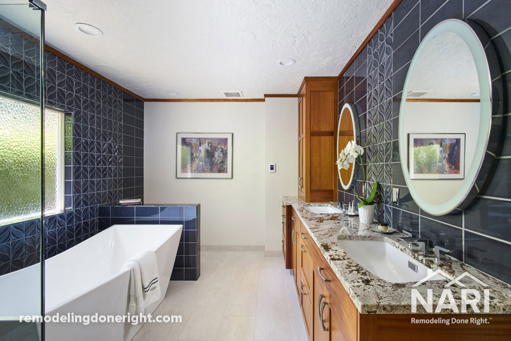 This bathroom had been remodeled about 12 years prior using quality materials, but the homeowner's priorities had shifted with time. The beautiful mahogany cabinetry and stone countertops were to remain in place; while other elements in the room were going to be improved. Clean lines, bold blocks of color in blue and white and hints of chrome add elegance to this contemporary bathroom project. The space features a curbless, glass-enclosed shower, heated tile flooring throughout, and porcelain tile for easier maintenance.
