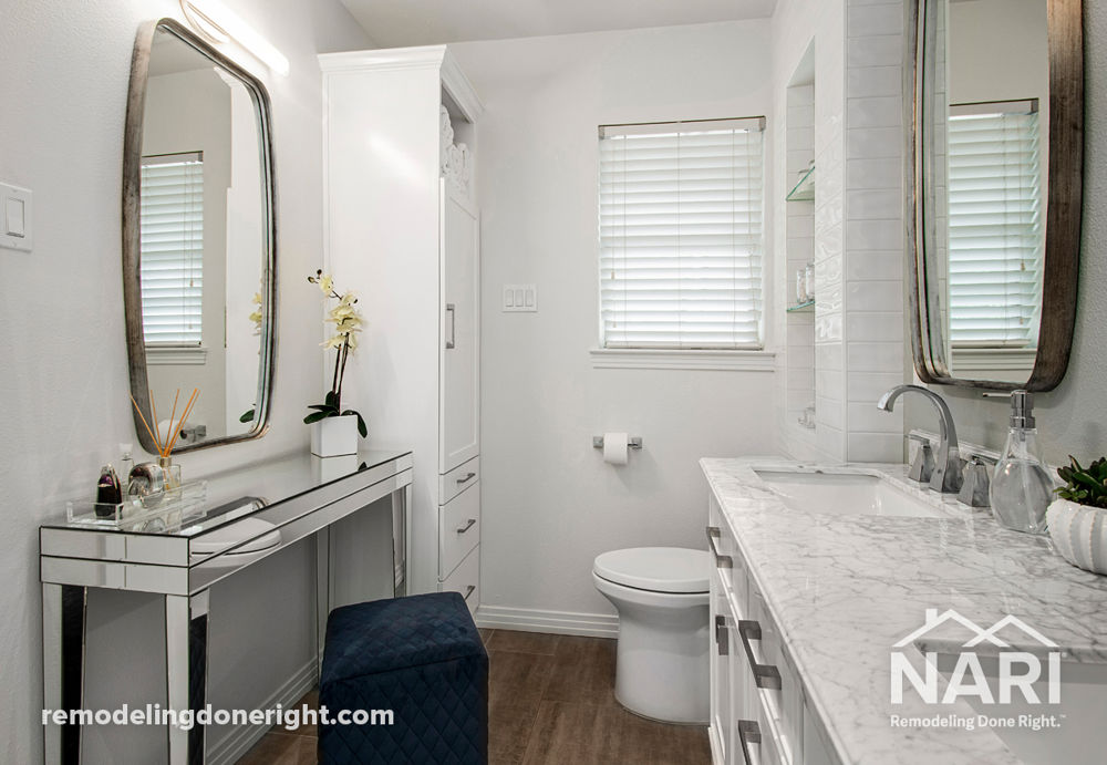 The master bath was smaller than the hall bath and could not fit more than one person at a time, which proved difficult for two professionals with similar schedules. They desperately needed a new HVAC system, and agreed early in the project to relocate it to the attic to gain much-needed space for the bath. Using space from a closet allowed for a double sink and a nice tub shower along with additional linen storage. The new bathroom is an extreme improvement from the original and provides the spa-like feel the owners wanted.