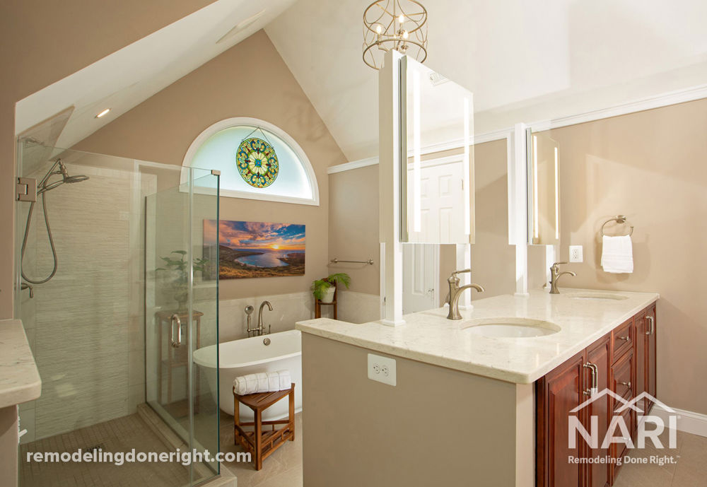 This unusual master bath was large and built on two levels, with an awkward flow. Prior to remodeling, the commode was on the upper level, the bathtub in the middle, and sinks on the lower level-two steps down. The shower was also small and cramped. In addition, the bath had heating and cooling issues due to its location above the garage. To create a spa-like master bath, sinks were relocated to the upper level, along with a European laundry, while a luxurious soaking tub and expansive shower were housed in the lower level, alongside a warming fireplace.