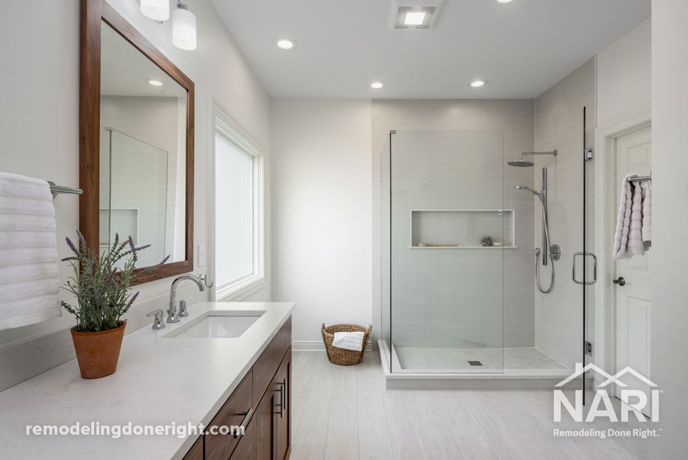 This is a stunning modern design-build remodel of an existing master bath built in 2002 that had an unused jetted soaking tub and builder grade standards. The dated style and function of the cabinetry, fixtures and finishes also needed an upgrade. The eco-conscious client has severe environmental allergies so careful consideration was paid to construction methods as well as to all finishes and products used. Simple clean lines and a monotone color palette of the minimalist design showcases the gorgeous custom walnut cabinetry with full overlay and the Cambria quartz countertops.