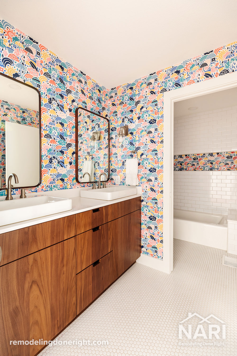 The clients purchased this 1965 midcentury modern home that needed some major updates. They have two small children so the existing room-connecting secondary bath was never going to work. Taking over a couple of closets helped reconfigure and expand this space. Since the clients love vintage, the midcentury modern theme was maintained with the cabinetry, rounded wood mirrors and hex tile floors. Bright colors were incorporated through the wallpaper and matching custom tile in the shower niche. This bath is now whimsically perfect for them!