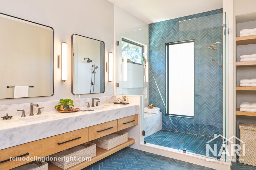 This West Austin couple was halfway through a re-design on their home when their dream house popped up for sale. Without hesitation they bought it and a new project was hatched. While the new house was in better shape, it needed several improvements including a new primary bathroom. Now this contemporary spa-like retreat features a vanity with a floating cabinet with large storage drawers, basket storage and a thick marble countertop, black mirrors and hardware. Accent tile runs from the floor up the shower wall. Set in a herringbone pattern, the tile adds color, texture and is the focal point of the room.