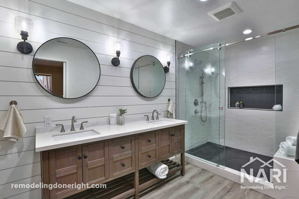 With two young children and a busy work schedule, these clients wanted an updated and functional primary bathroom where they could go into and feel relaxed. The original layout had wasted space and a never-used steam sauna. Adding more recessed lights and LED sconces brightened up the space. Replacing the tile with an SPC wood look created a warmer, calmer bathroom. The new space includes a large shower and a wood grain vanity. Mixing black and nickel finishes added depth to the space. Texture was added throughout the room by installing shiplap, penny rounds on the shower floor, and the picket geometric tile.