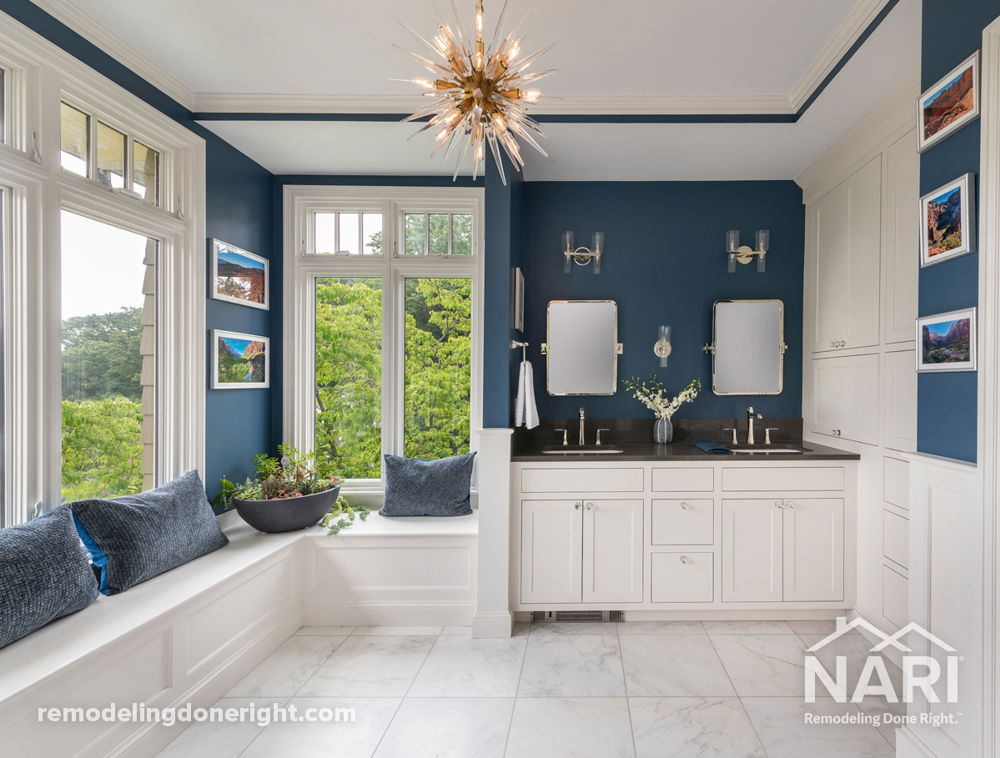 This master bathroom was completely updated while keeping the charm, character and integrity of this early 1900s Queen Anne home. Specifically, the space was gutted and remodeled using a blend of traditional and contemporary design to deliver an elegant, grand master bathroom and a separate water closet. The bathroom includes custom double vanities with wall built-ins and bench seating/storage and a barrier free shower. Features include shaker style cabinets, grey honed countertops, and deep blue walls. Due the age of the home and many past remodels, advanced problem solving was needed for the intricate plumbing, heating and retrofitting of the windows.