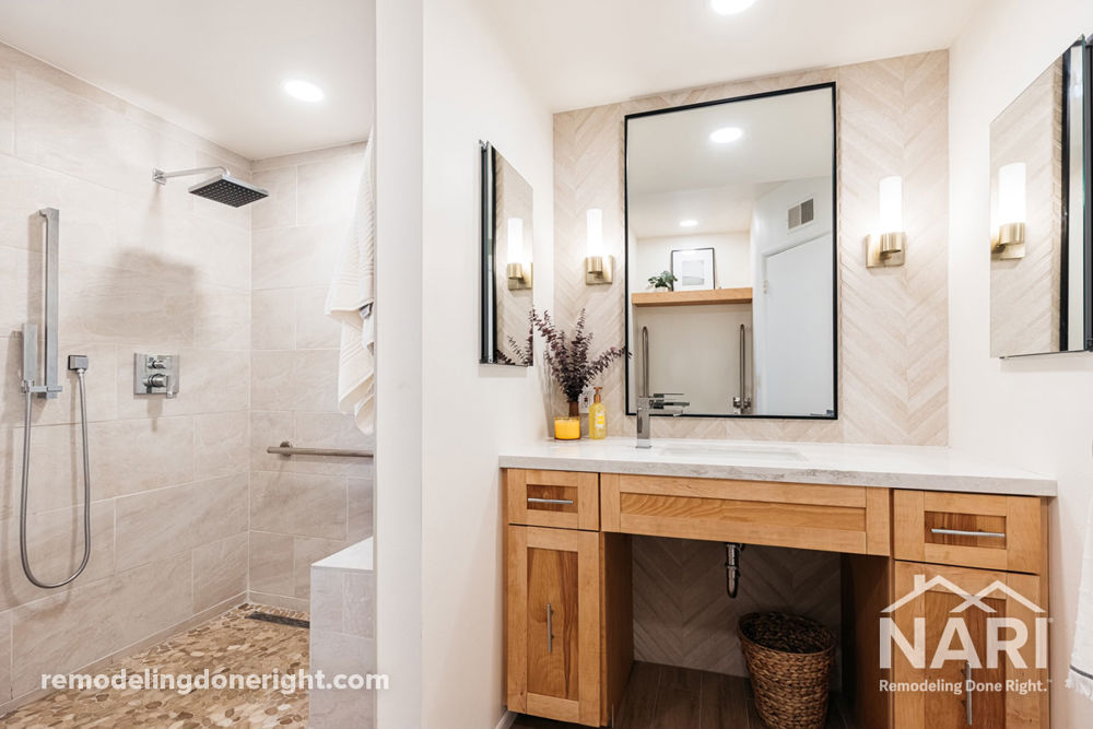 The clients wanted to update and make their master bathroom more ADA accessible. The space needed to accommodate a wheelchair and provide the client more freedom and accessibility. The bathroom also needed a spa-like feel. The ADA accessible bathroom features a higher toilet with heated bidet seat and retractable grab bars, a glass free wet area for the shower, and a custom vanity for wheelchair access. The new space also features large format tiles on the wall and a clean look that stays fresh with minimal effort.