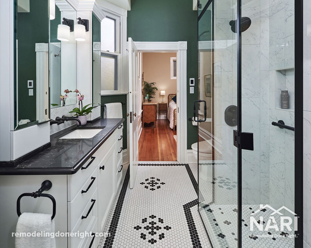 The homeowners requested a look that honored their 1890 home but was fresh and contemporary at the same time. Specifically, they wanted to replace an existing clawfoot tub with a comfortable walk-in shower suitable for aging-in-place, and add storage. Vintage and industrial styles come together in this small bath project, which features a walk-in shower, extra storage and more. The crisp pairing of black and white blends seamlessly with the period style of the home. A favorite feature is the tiled floor border design with three medallions, which makes a great visual accent to this room, as does the vanity and mirror configuration.