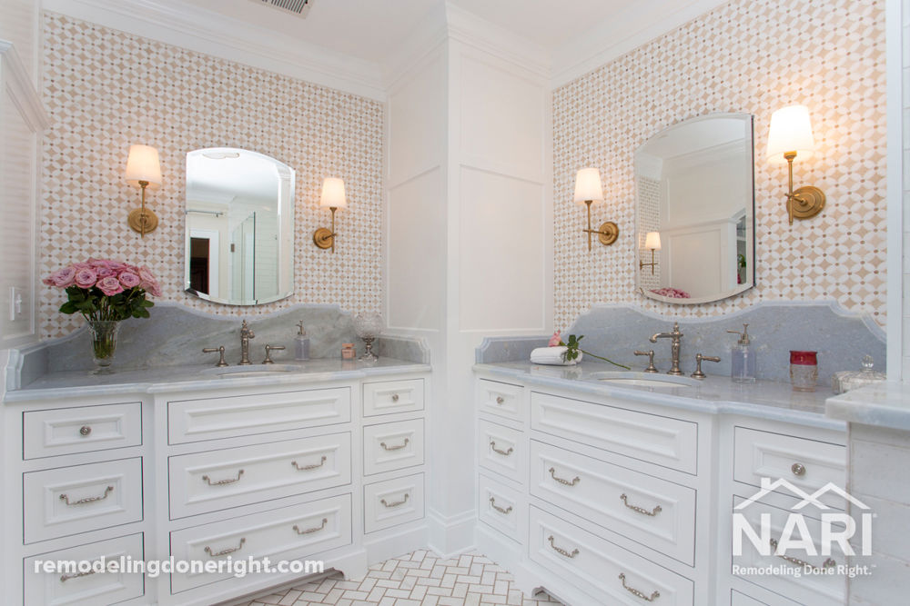 This master bathroom remodel was part of a duplex conversion that required converting the second-floor kitchen into a master bathroom. The client desired a luxurious and relaxing retreat with a drop-in tub, shower and two vanities in the new space. Architectural details such as wood paneling, chair rail trim, an arched opening over the tub and layered crown molding complement the architectural elements throughout the home. The marble countertops with decorative shaped backsplashes, mosaic marble tile, gold toned decorative light fixtures, polished nickel plumbing fixtures and the heated floor also contribute to the luxurious feeling within the space.