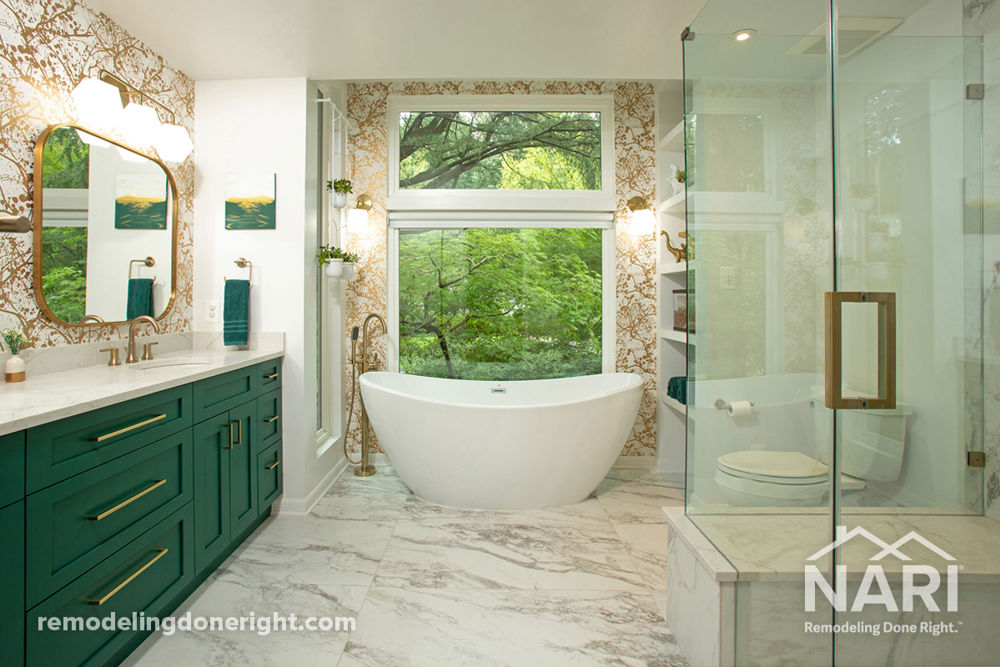 The clients desired a luxurious master bath remodel. The new master bath features a freestanding soaking tub, double bowl vanity, and large shower designed amongst a wooded setting. The floors, shower walls, and bench seat are adorned with porcelain tile that looks like marble. Other accents include a herringbone pattern tile shower floor, frameless glass enclosure and fixtures with a champagne bronze finish. The vanity accommodates both spouses and is trimmed in emerald green cabinetry with matching champagne bronze accents for the fixtures and mirrors. The clients absolutely love their new master bath.